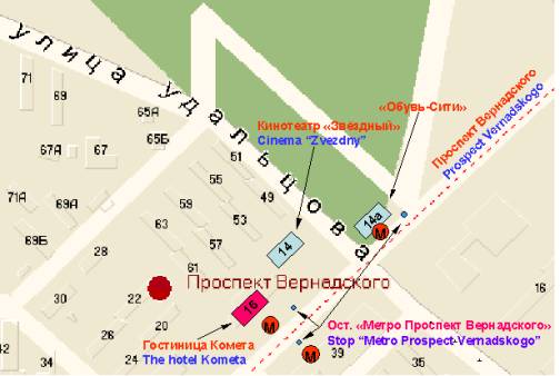 "Prospekt Vernadskogo", exit to the cinema "Zvezdny". The Hotel is situated