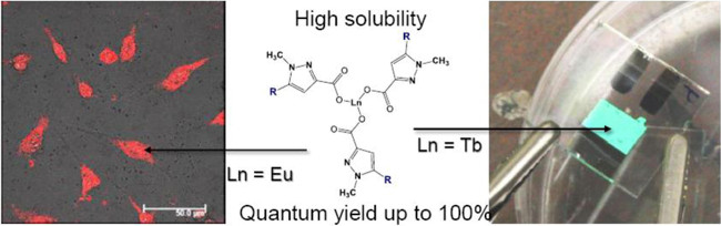 люминесцируют зеленым цветом, комплексы европия – красным, а гадолиния – синим.