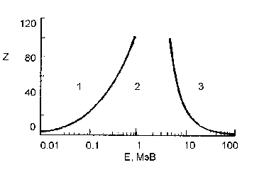 Рис.2.2. Области преобладания фотоэффекта (1), комптоновского рассеяния (2) и образования пар (3) в зависимости от энергии фотонов и атомного номера среды.