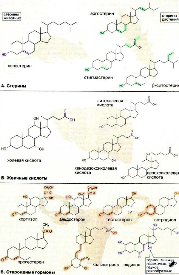 Три наиболее важные группы стероидов составляют cтерины, желчные кислоты и