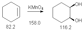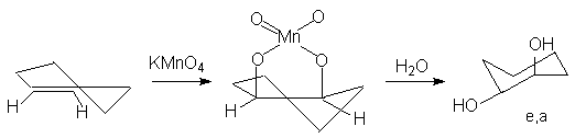 Образующиеся промежуточно циклические эфиры марганца и осмия обусловливают протекание стереоселективного син-присоединения обоих атомов кислорода по sp2-углеродным атомам двойной связи. Так, при окислении циклических олефинов, например, циклогексена, образуются цис-циклоалкан-1,2-диолы (син- или цис-гидроксилирование алкенов).